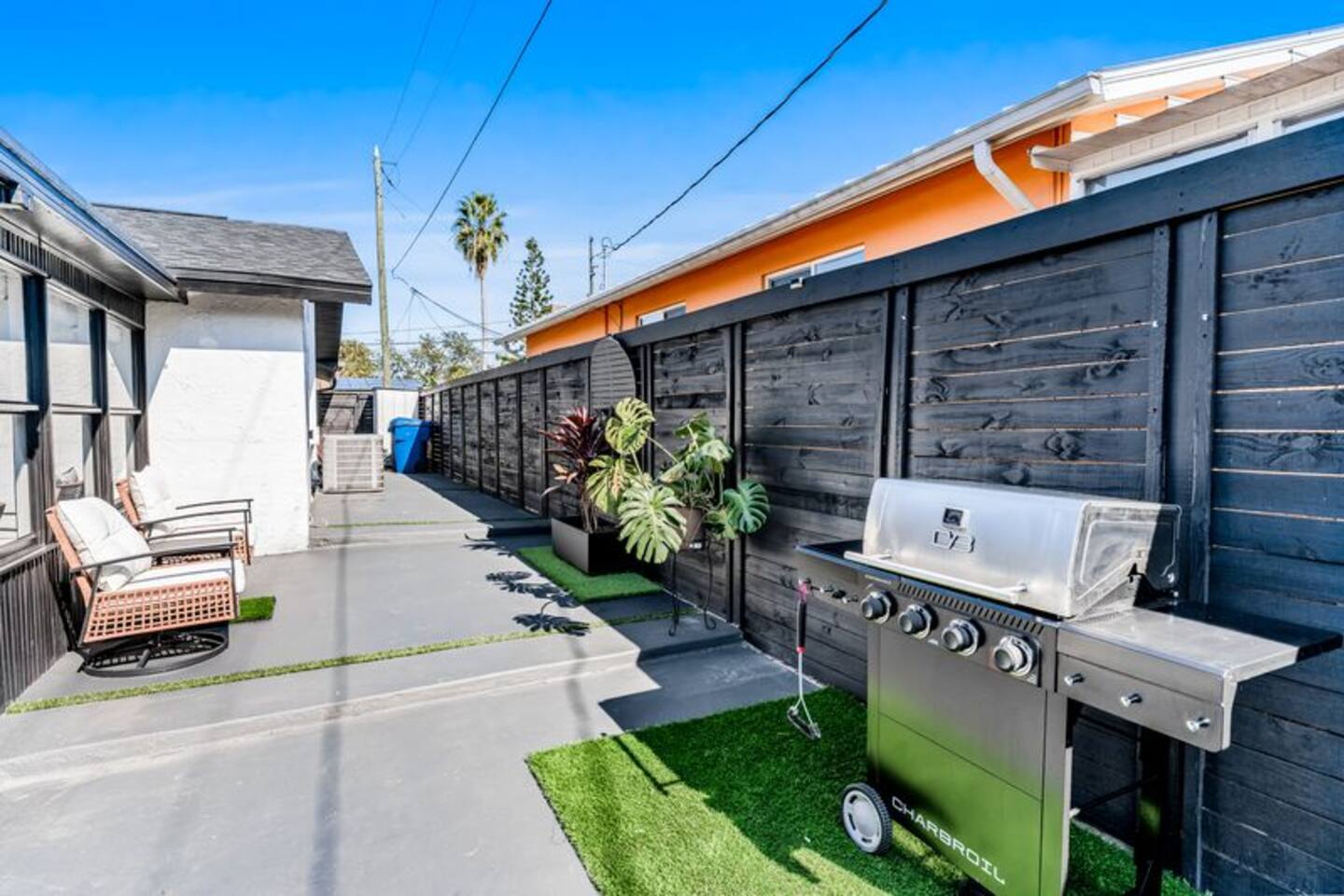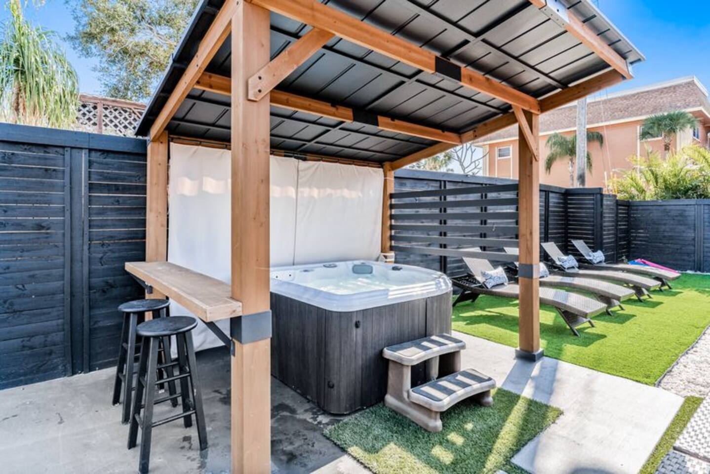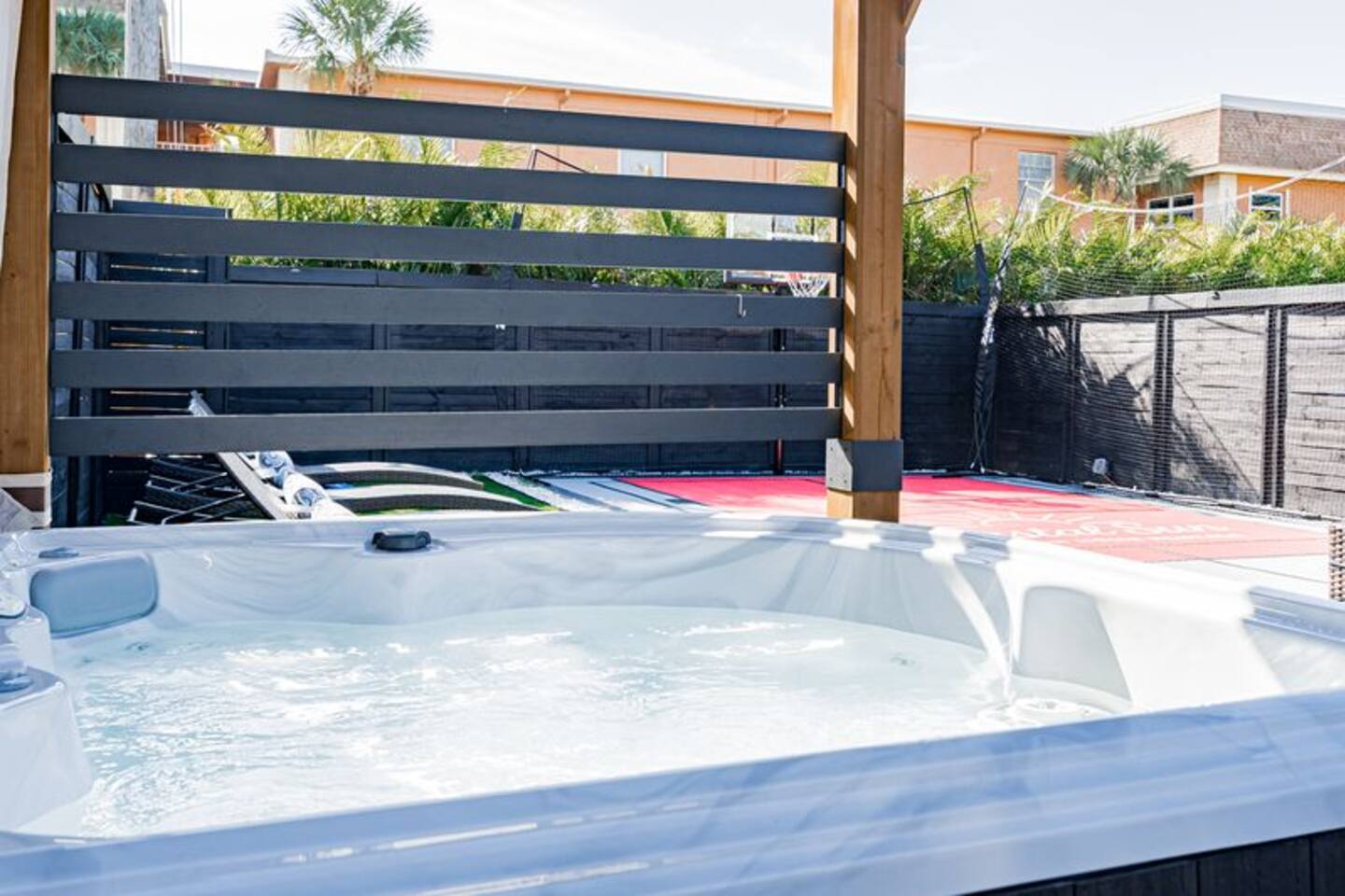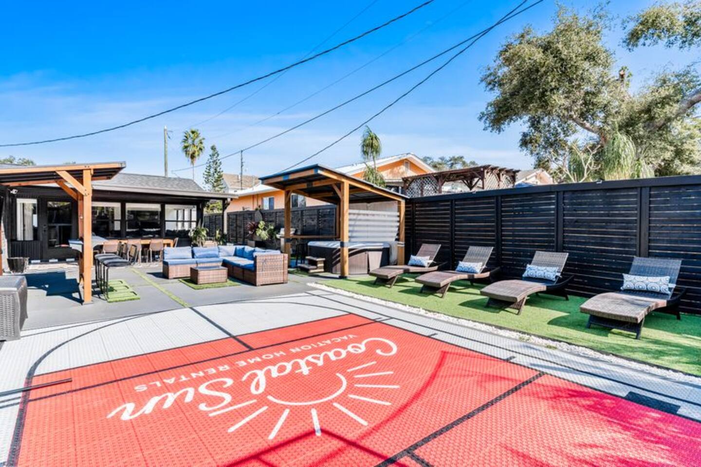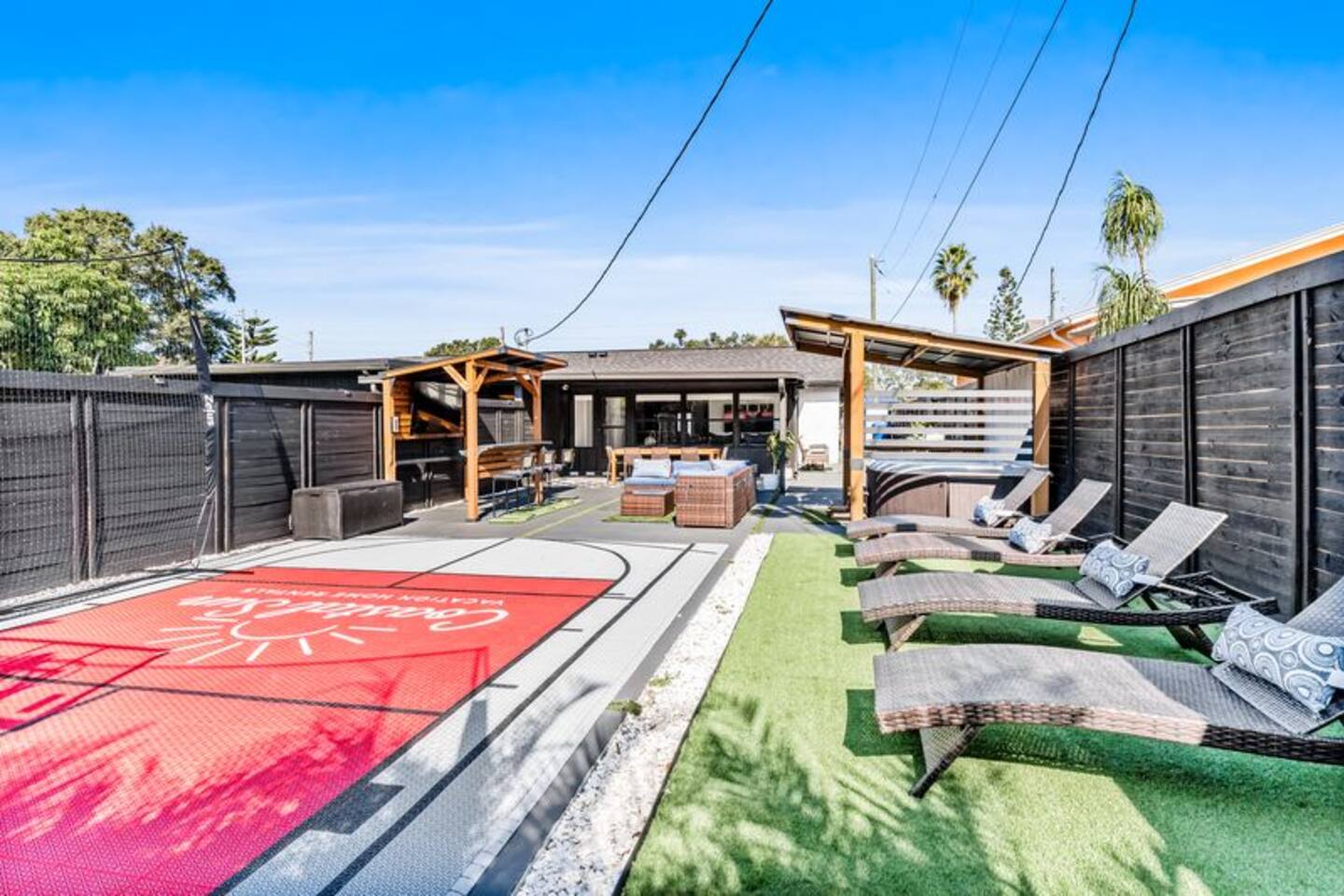 Perfect for Families or Groups of 6 Enjoy 3 comfortable bedrooms, 1 full bathroom, and a spacious backyard perfect for relaxing and unwinding any time of day. Quick, easy, and contactless check-in and check-out for a seamless stay. Comforts of Home Cook up your favorite meals in the fully equipped kitchen, cozy up in the living room, or take advantage of smart TVs, Wi-Fi, laundry facilities, and more—everything you need for a comfortable stay. Outdoor Fun & Entertainment Step outside to your private backyard oasis! Enjoy the basketball court, pickleball net, cornhole game, and hot tub. Dine at the outdoor table, relax on the lounge sofa, watch your favorite shows on the outdoor TV at the bar area, or soak up the sun on comfortable lounge chairs. Pet-Friendly Bring your furry friends! Maximum of 2 dogs per reservation ($115 per dog). Dogs must be declared at booking. The fully fenced yard ensures safety and peace of mind. Sleeping Arrangements Master Bedroom: King Bed Bedroom #2: Queen Bed Bedroom #3: Queen Bed Each room is equipped with its own smart TV. Bathroom Modern, bright, and stocked with essentials for your convenience. 🌴 Key Features Entertainment – Basketball, pickleball, and cornhole Hot Tub – Perfect for relaxation Stunning Outdoor Lounge – Comfy seating, outdoor TV, BBQ grill, and bar area Stylish & Clean – Modern decor with attention to detail Prime Location – Close to shops, restaurants, and just minutes to gorgeous Gulf beaches Note: This property is part of a duplex. Each unit features 2 parking spots, its own entrance and its own private backyard. Nearby Attractions Indian Rocks Beach: 3 miles Clearwater Beach: 8.3 miles Madeira Beach: 8.4 miles John's Pass: 8.4 miles Tampa International Airport: 21 miles St Pete/Clearwater Airport: 10 miles St. Pete Pier: 21 miles